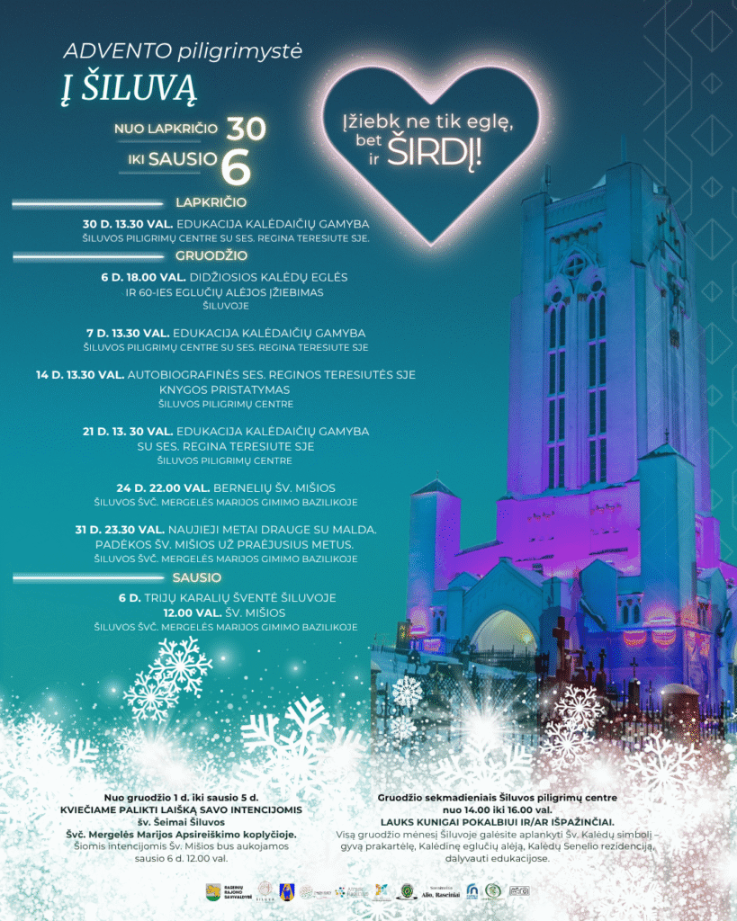 Šių metų advento laikotarpį, kuris suvienija skirtingas institucijas vardan bendruomeninio džiaugsmo, kviečiama į veiklas Šiluvoje, kuriose jungsis edukacija, Kalėdaičių gamyba, švies 60 eglučių ir viena didžioji eglė, prakartėlė, laiškai Šventajai šeimai, Kalėdų Senelio rezidencija ir, be abejo, šv. Kalėdų laukimas. Nuo gruodžio 1 d. iki sausio 5 d. kiekvienas turės galimybę palikti laišką asmeninėmis intencijomis Šv. Šeimai Šiluvos Švč. Mergelės Marijos Apsireiškimo koplyčioje. Šiomis intencijomis Šv. Mišios bus aukojamos sausio 6 d. 12.00 val. O gruodžio sekmadieniais Šiluvos piligrimų centre nuo 14.00 iki 16.00 val. lauks kunigai pokalbiui ir/ar išpažinčiai.